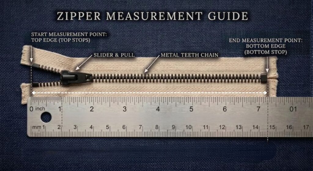 When a pattern calls for a 22-inch zipper, that number refers to the functional length, from the top stop to the bottom stop. The extra tape above and below those stops does not count. Measure stop to stop, not end to end, or you will pull a zipper from your stash thinking it fits and discover at the machine that it does not.